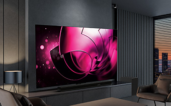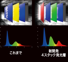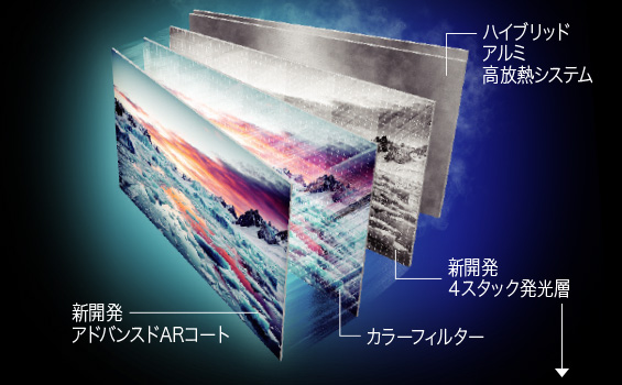 有機EL発光層を3色4層にし、従来の約1.3倍*1の明るさを実現。また、各色純度を高めることで色域も約1.1倍*2へ。さらに、新開発の低反射ARコートで外光の映り込みを約3割*3低減しました。