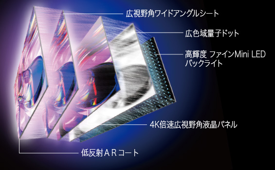 新開発Mini LEDバックライトで、従来の約1.3倍*1明るく、きめ細やかなエリアコントロールで高コントラストを実現。さらに、低反射ARコートやワイドアングルシート*2などで、斜めから見ても高画質を保ちます。