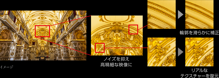 絵柄の精細さに応じて適切な超解像技術で高精細化。地デジなどの4Kに満たないコンテンツも高精細に映し出します。
