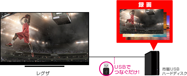 レグザは、市販のUSBハードディスクを使って手軽に録画ができます。1台(4TB)で約502時間*1(HDレート:17Mbps)のハイビジョン録画が可能です(最大で8TB*2までのUSBハードディスクに対応)。また、最大4台(登録*3は8台まで可能)までの同時接続*4に対応。より長時間の録画が可能です。
