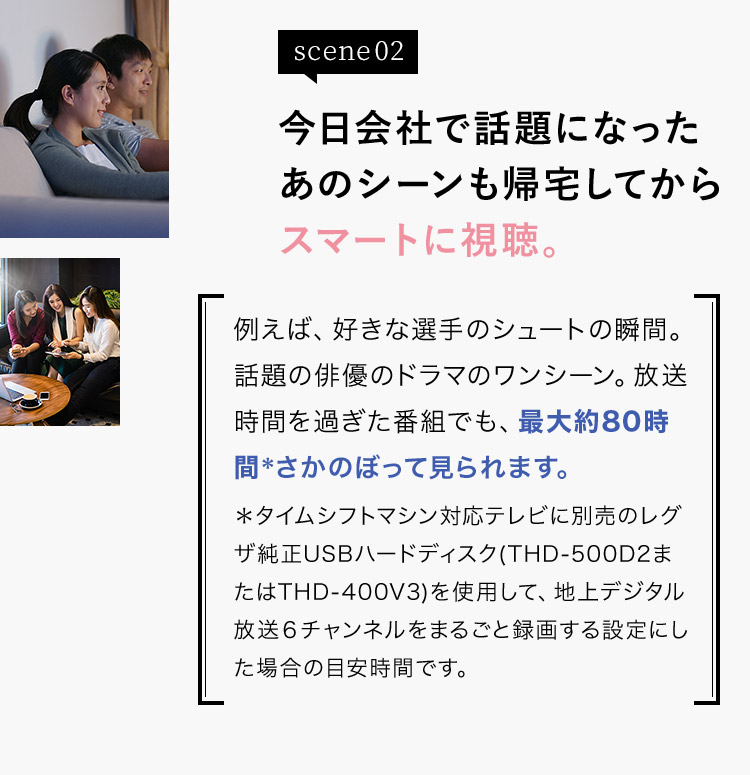 *タイムシフトマシン対応テレビに別売のレグザ純正USBハードディスク(THD-600D3またはTHD-400V3)を使用して、地上デジタル放送6チャンネルをまるごと録画する設定にした場合の目安時間です。