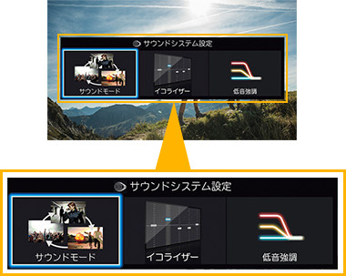 シンクロドライブ方式に対応している機種に接続することで、さらに豊かなサウンド再生を可能にします。Z20Xシリーズとの接続では、ツイーター(高音用スピーカー)とシンクロし、より繊細な高音域再生を実現。Z20Xシリーズ以外との接続では、メインスピーカーとシンクロし、よりパワフルでクリアなサウンド再生を実現します。また、シンクロドライブ方式対応機種のみ、「サウンドモード」「イコライザー」「低音強調」という様々な専用メニューを搭載。さらに広がりのある豊かな音質が楽しめます。